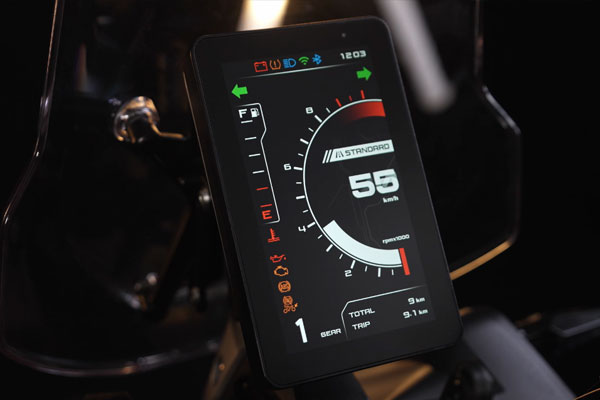 Pantalla color de 7 pulgadas con proyección de navegación desde smartphone. Incluye T-BOX conectividad Bluetooth, puerto USB-C, comandos retroiluminados y 1 año de acceso gratuito a Morbidelli Connect. Incorpora botón SOS, alertas por vibración y movimiento, seguimiento en tiempo real y apagado remoto del motor, todo gestionado desde la app Morbidelli Connect.